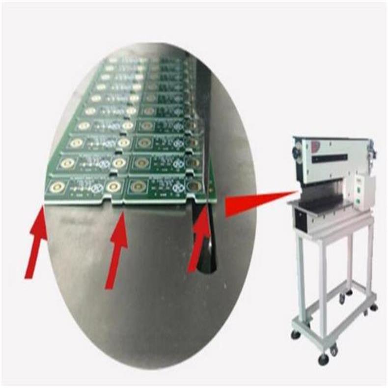 將要進行分切的V-CUT連板的V形槽對準下切刀的刀刃口,順著刀刃送入到刀內適當位置進行防呆,然后腳踩腳踏閥,氣缸工作使上切刀下降,從而將V-CUT連板分離.